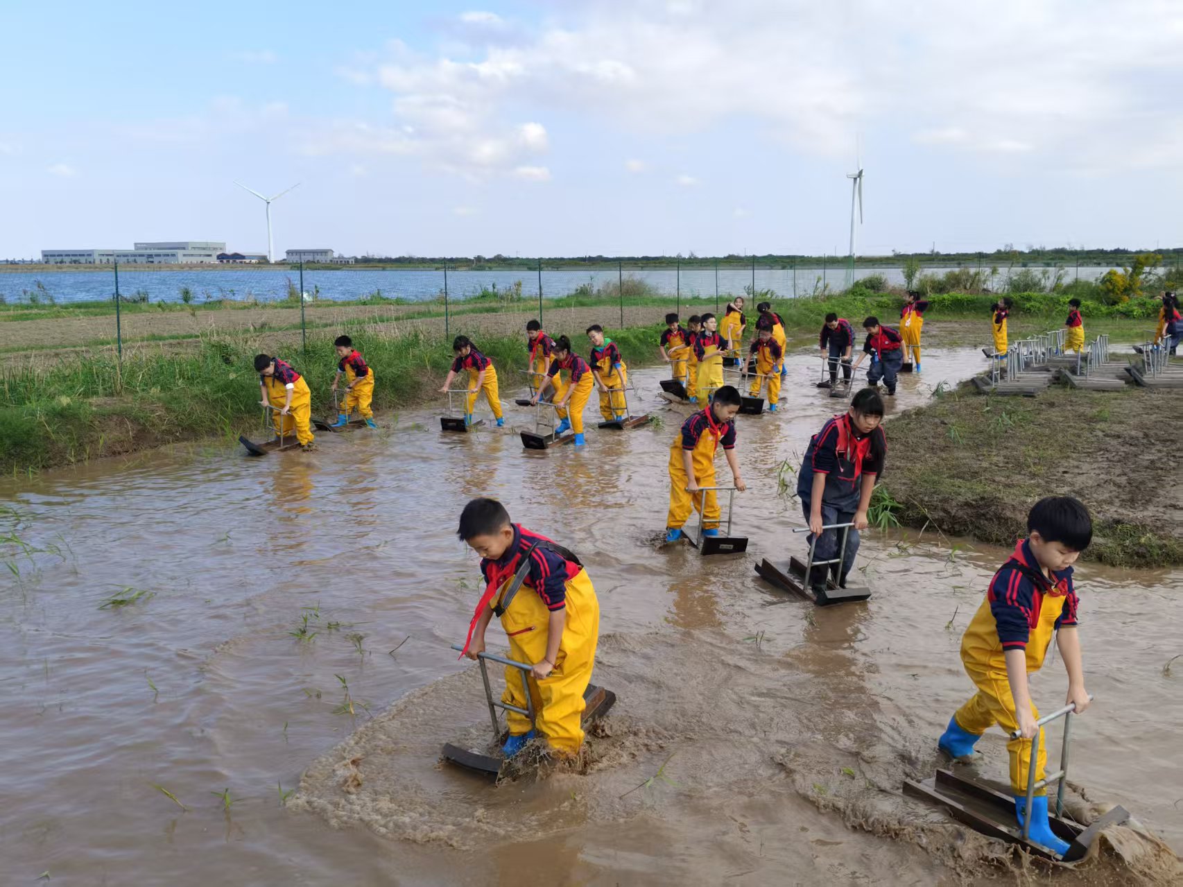 除了食品科学探索,学生们还以“滩涂小司机”的身份,沉浸式体验慈溪特色滩涂农耕民俗。学生们骑上泥马船在滩涂滑行,在鱼塘里捕鱼,寻觅秋日收获,在欢声笑语中感受围垦农耕的辛劳与快乐,也加深了对本土文化的认识。